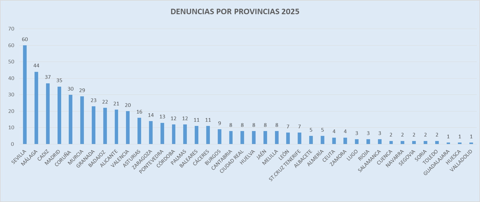 El ranking está encabezado por Sevilla, con 60 denuncias, seguido de Málaga (44), Cádiz (37), Madrid (35) y La Coruña (30).