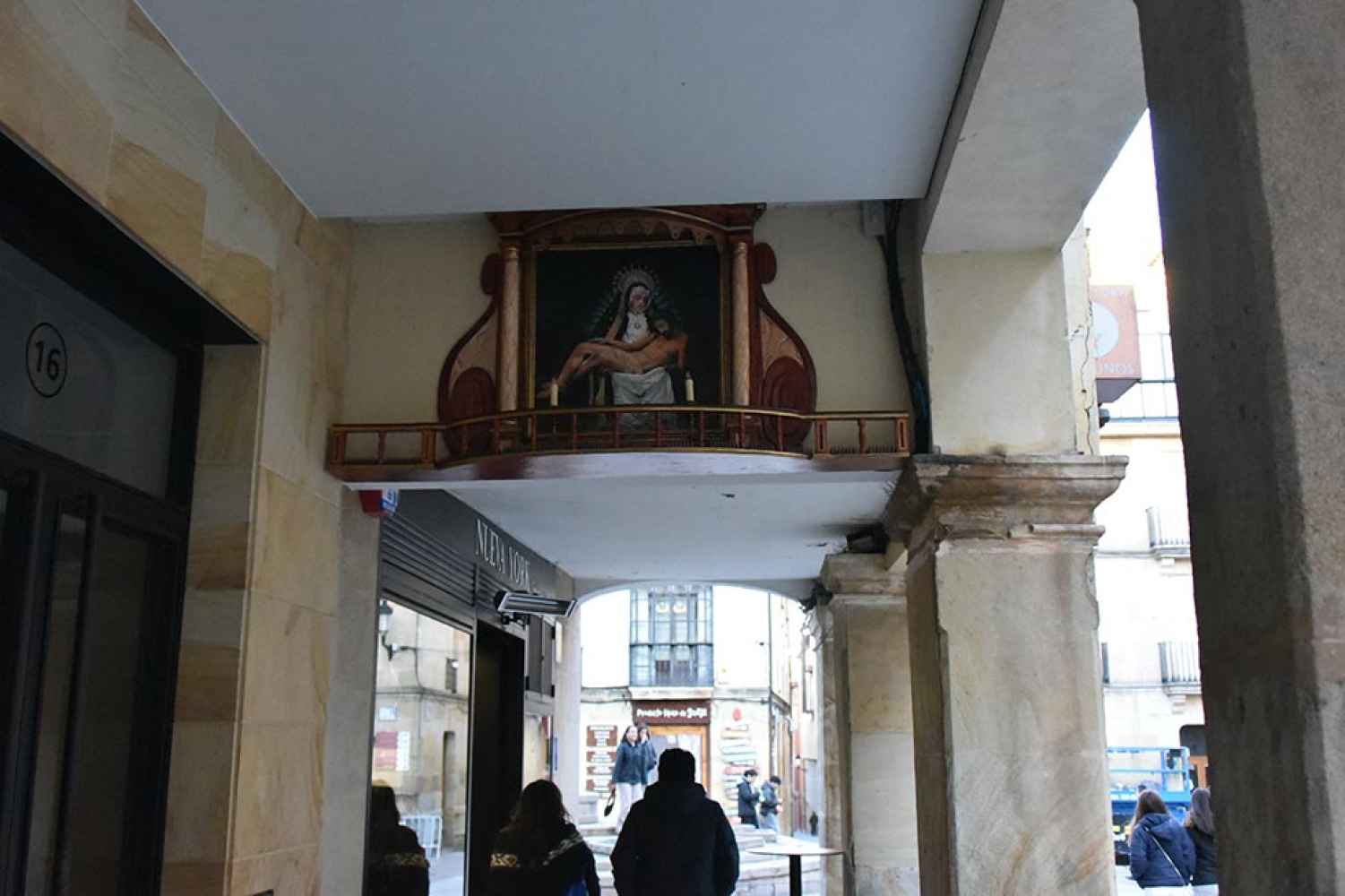 El altar de la Virgen de la Soledad ha regresado a su ubicación en los soportales del céntrico El Collado, tras una restauración recibida con agrado por los vecinos.