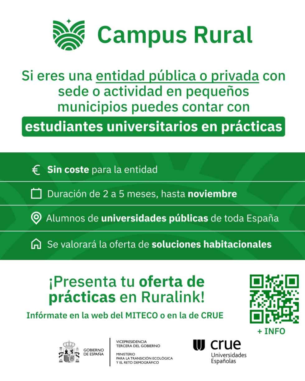 La Subdelegación del Gobierno en Soria ha remitido a las entidades locales la provincia la información de la edición 2026 del programa Campus Rural y anima a entidades públicas y privadas con sede o actividad en nuestros municipios a presentar ofertas de prácticas para estudiantes universitarios.