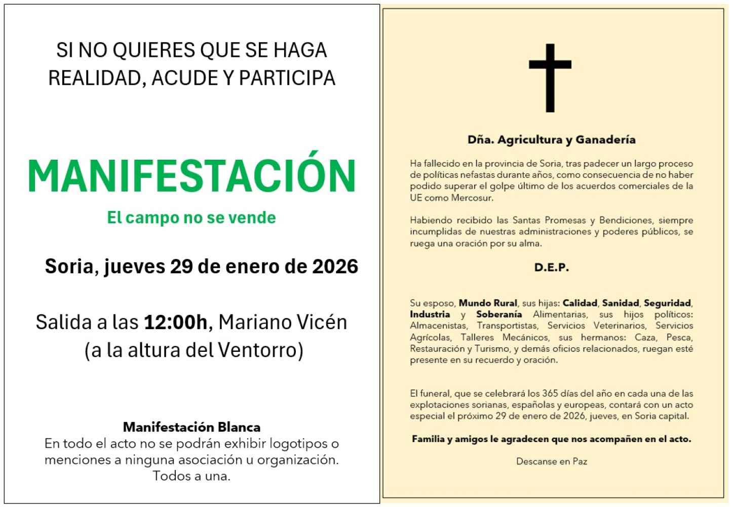 Los agricultores y ganaderos de Soria se manifestarán mañana jueves por las calles de la ciudad en defensa del campo y la alimentación, para rechazar el acuerdo de Mercosur que amenaza con terminar con el sector primario.