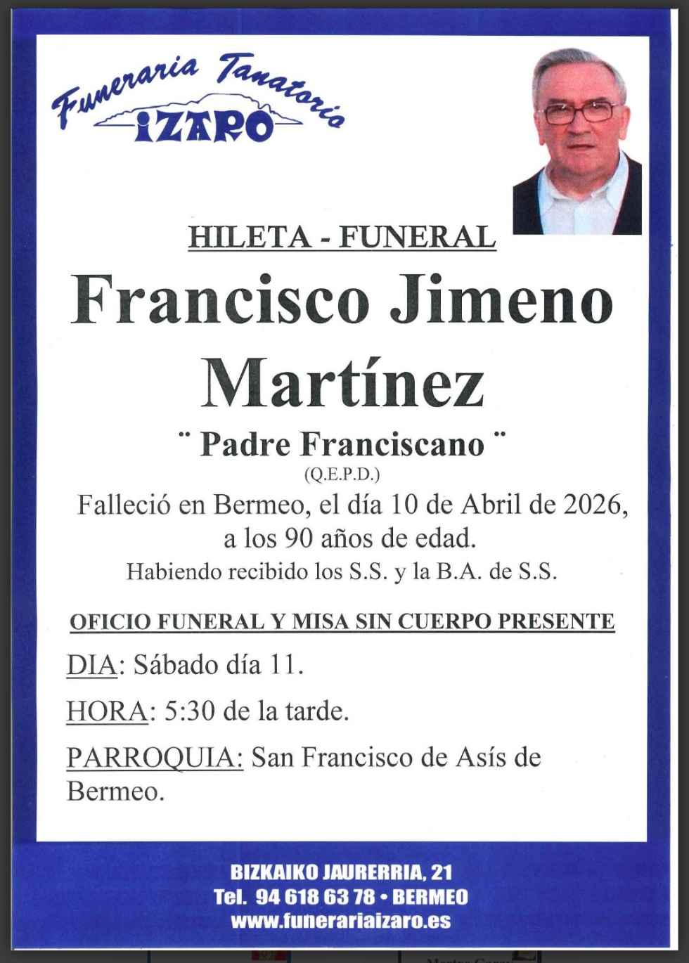 Fallece en Bermeo el franciscano Francisco Jimeno