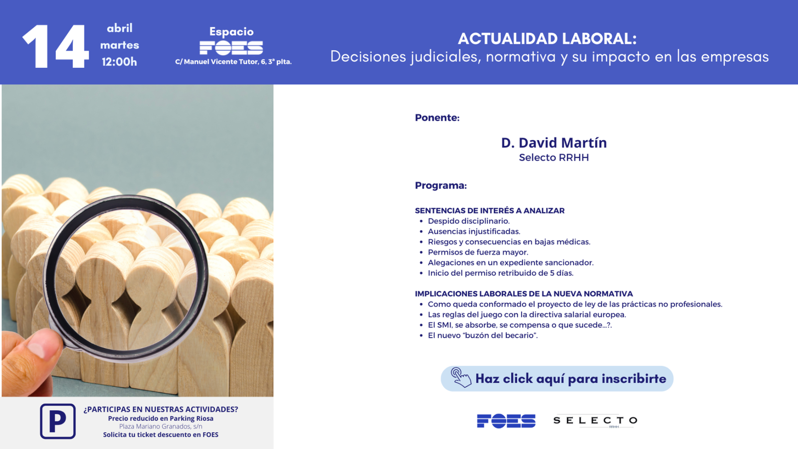 La jornada, recogida bajo el título ‘Actualidad laboral: decisiones judiciales, normativa y su impacto en las empresas’, se celebrará el próximo martes, 14 de abril, a las 12.00 horas, en el EspacioFOES (calle Manuel Vicente Tutor, 6 – tercera planta).