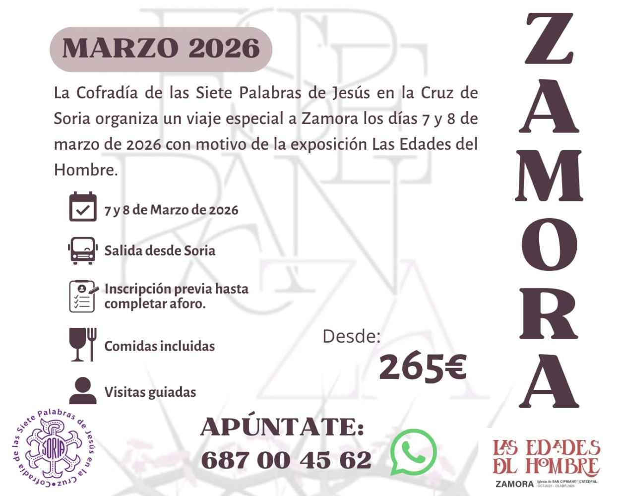 En el precio está incluido el autobús ida y vuelta desde Soria, alojamiento y desayuno en Zamora, comidas y visitas guiadas a Zamora, exposición de Las Edades del Hombre y Toro.