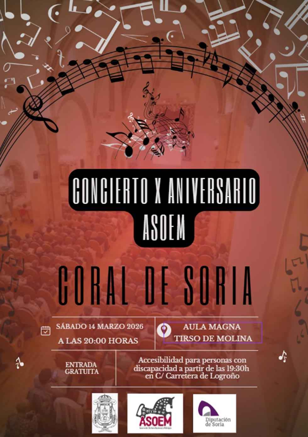 La Coral de Soria ofrecerá el próximo sábado 14 de marzo a las 20:00 horas un concierto en el Aula Magna Tirso de Molina, dentro del acto organizado por la Asociación de Esclerosis Múltiple de Soria (ASOEM) con motivo de su décimo aniversario.