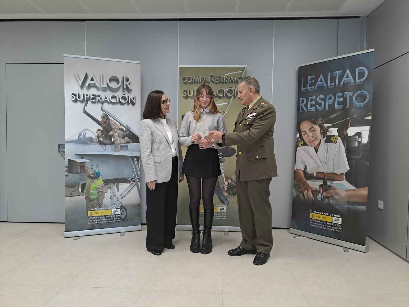 Al acto de entrega de premios la acompañaron la directora del IES Castilla, Ana Aguayo, así como una representación de la Subdelegación de Defensa, compuesta por el subdelegado, el jefe del Órgano de Apoyo y el del Área de Reclutamiento.