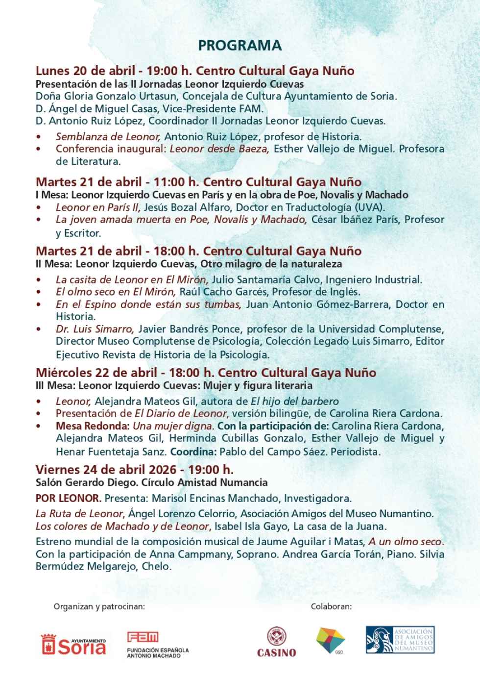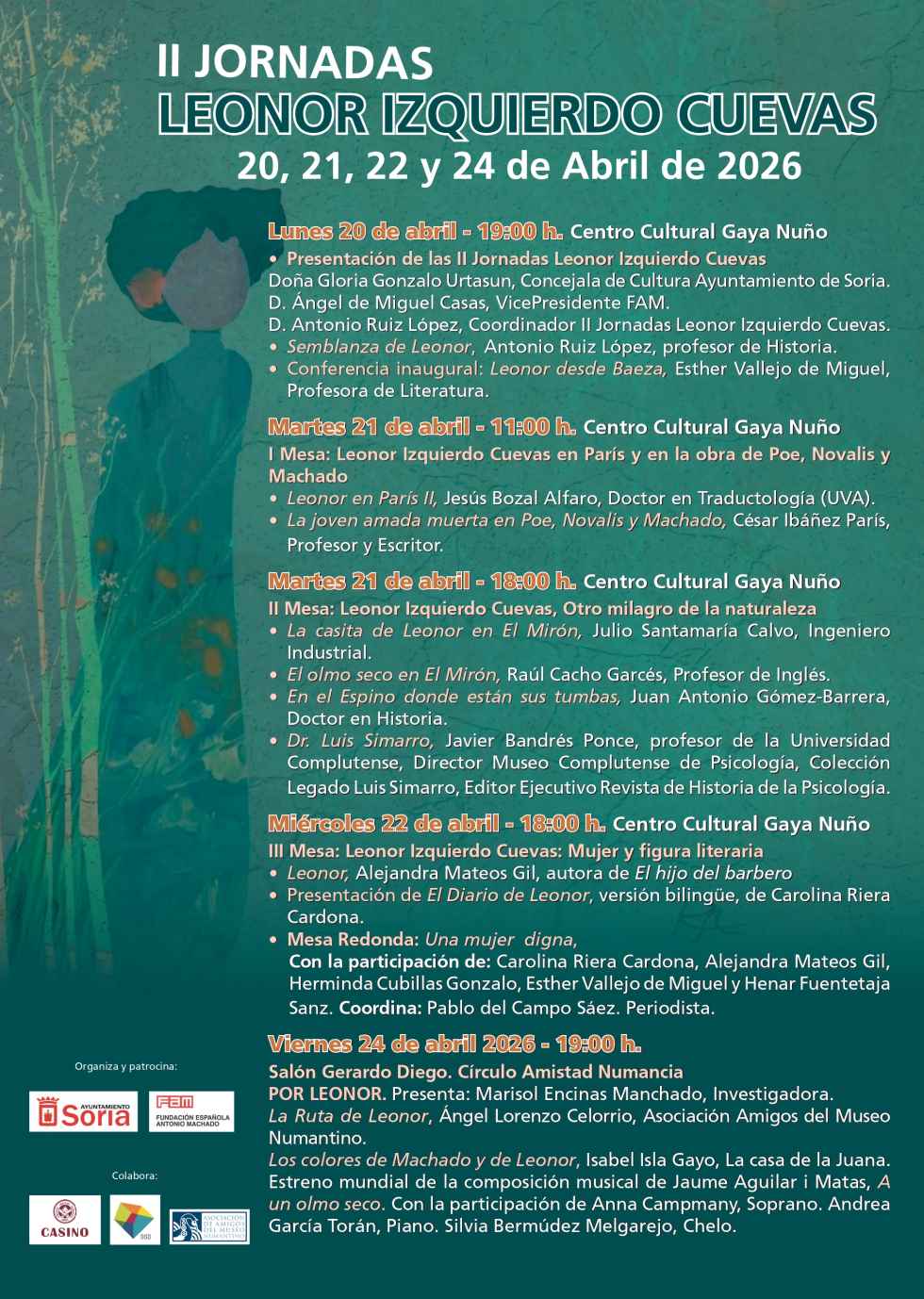 A unos meses de cumplirse el 114 Aniversario de su fallecimiento, el Ayuntamiento de Soria y la Fundación Española Antonio Machado repasarán en las II Jornadas Leonor Izquierdo Cuevas aspectos significativos y novedosos de su vida.