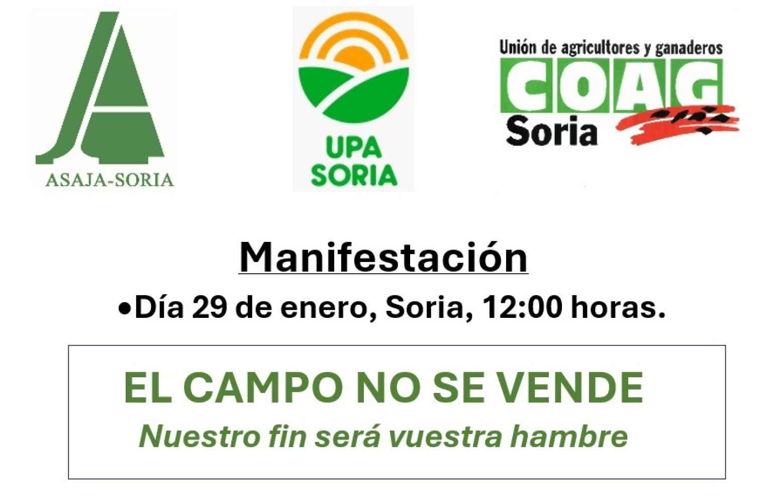 Las organizaciones profesionales agrarias ASAJA, Upa y Coag han convocado esta manifestación y concentración que partirá a las 12:00 horas el 29 de enero desde la avenida Mariano Vicén para dirigirse hasta la Delegación Territorial de la Junta de Castilla y León y la Subdelegación del Gobierno, para terminar con un acto solemne de sepelio por la agricultura y ganadería soriana, española y europea, en la Plaza de Mariano Granados.