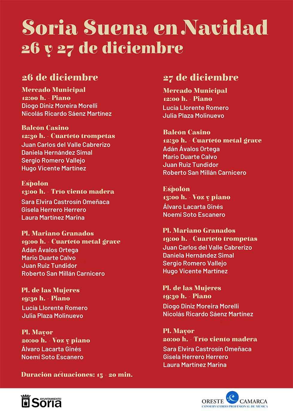 El alumnado del conservatorio de música de Soria ambientará musicalmente diferentes puntos de la ciudad durante el 26 y 27 de diciembre de estas fechas navideñas. Conozca horarios y escenarios.