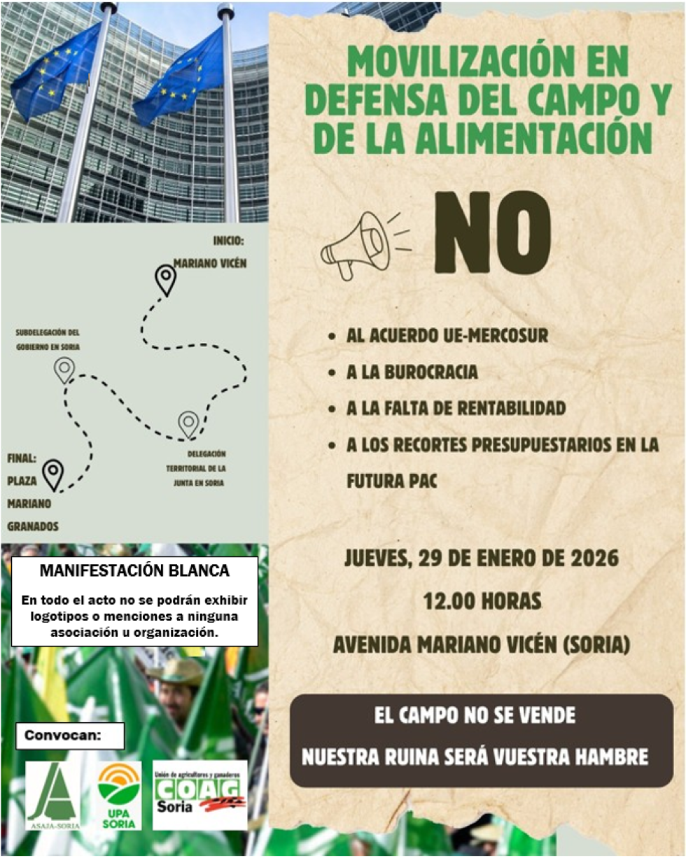 Las organizaciones convocantes de la manifestación que se celebrará en Soria capital el próximo día 29 de enero, con el fin de que todos los agricultores, ganaderos y simpatizantes, independientemente de su adscripción, puedan asistir con plena libertad, han decidido que el formato sea una "manifestación blanca", renunciando a cualquier protagonismo en esa cita, en la que estará prohibida la exhibición de logotipos o menciones a cualquier asociación u organización agraria.