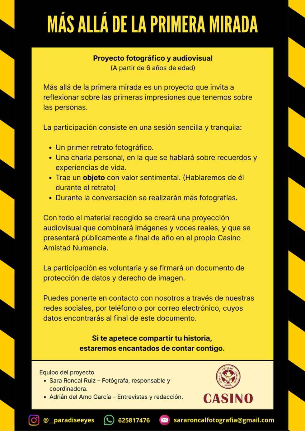 Para ello buscan participantes voluntarios, socios y asiduos al Círculo Amistad Numancia interesados por la cultura, la fotografía y la reflexión social.