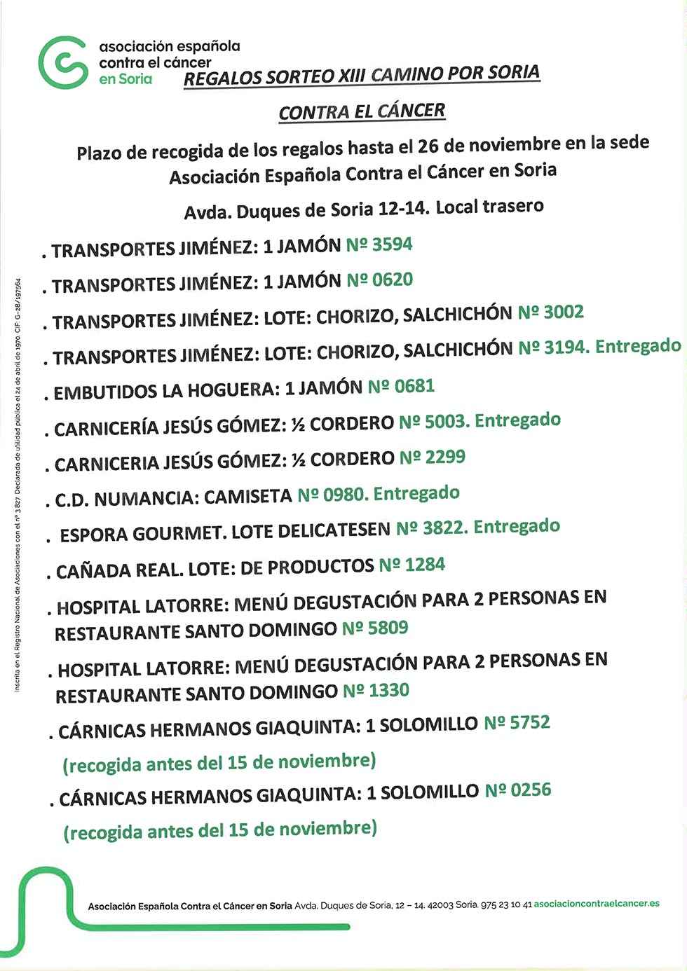 La delegación soriana de las AECC ha dado a conocer los números agraciados del sorteo del "XIII Camino por Soria Contra el Cáncer".