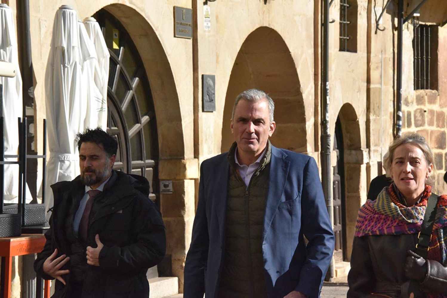 Ortega Smith, acompañado de los concejales de Vox, Fernando Castillo y Sara López, ha censurado la imposición de la ZBE en Soria, que se está realizando contra la propia ley, ya que ésta exige implantarla en municipios de más de 50.000 habitantes, una cifra de población que Soria está todavía lejos de alcanzar,.