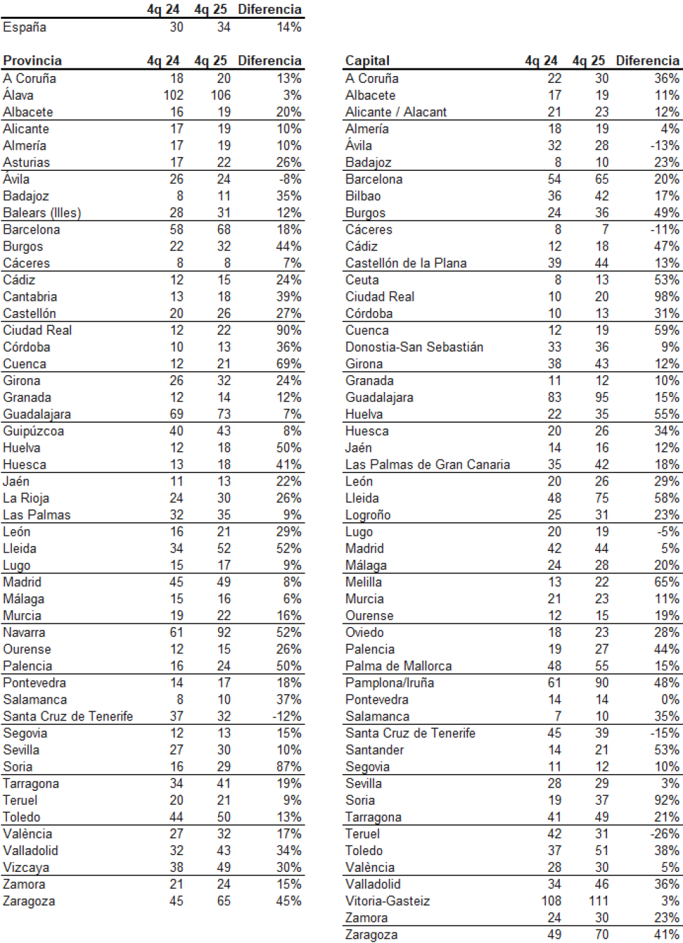 Por el contrario, en cinco capitales la competencia se redujo: Teruel (-26%), Santa Cruz de Tenerife (-15%), Ávila (-13%), Cáceres (-11%) y Lugo (-5%).