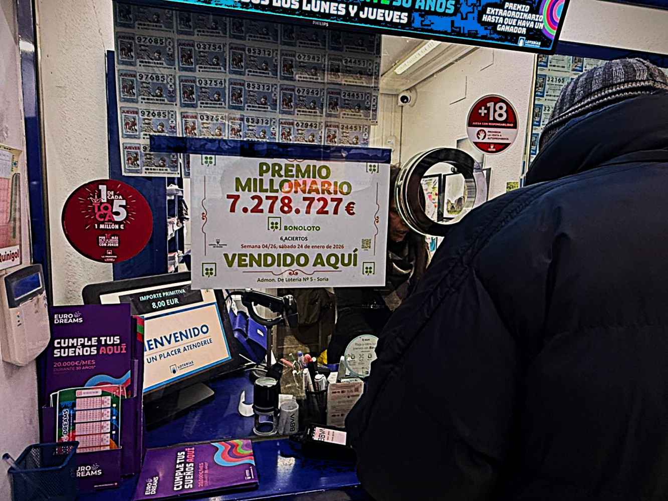 El único acertante de primera categoría de la Bonoloto validó su boleto en la Administración número 5 de Soria, en la calle Estudios, y le han correspondido 7.278.727 euros, a lo que habrá que descontar lo que se quedé Hacienda.