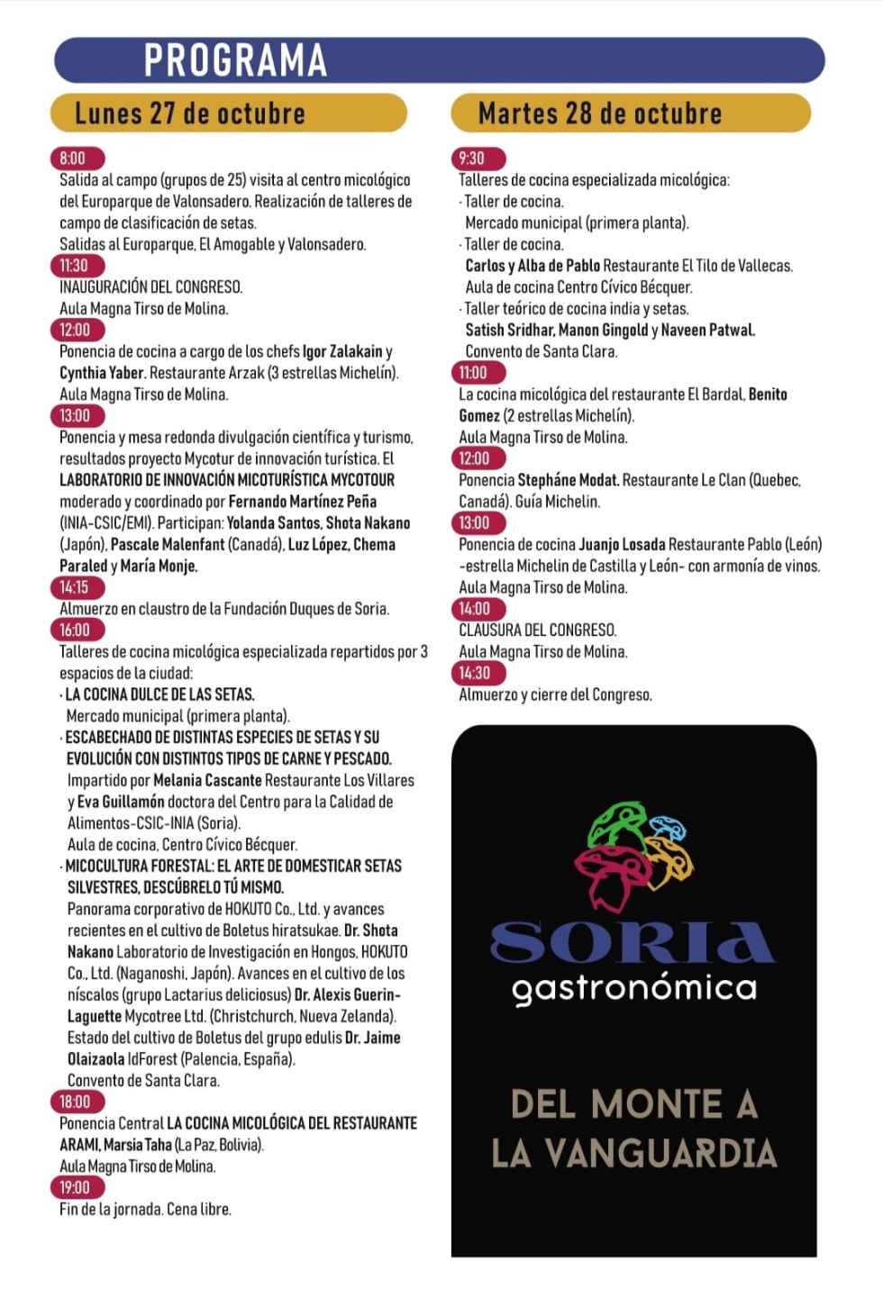 En este sentido, el Ayuntamiento de Soria pone a disposición del Congreso el Convento de Santa Clara, el Aula de Cocina del Centro Cívico Bécquer y la sala de cocina del Mercado Municipal. Además, se celebrarán talleres en el campo con visitas al parque micológico de Valonsadero, en el término municipal de Soria.
