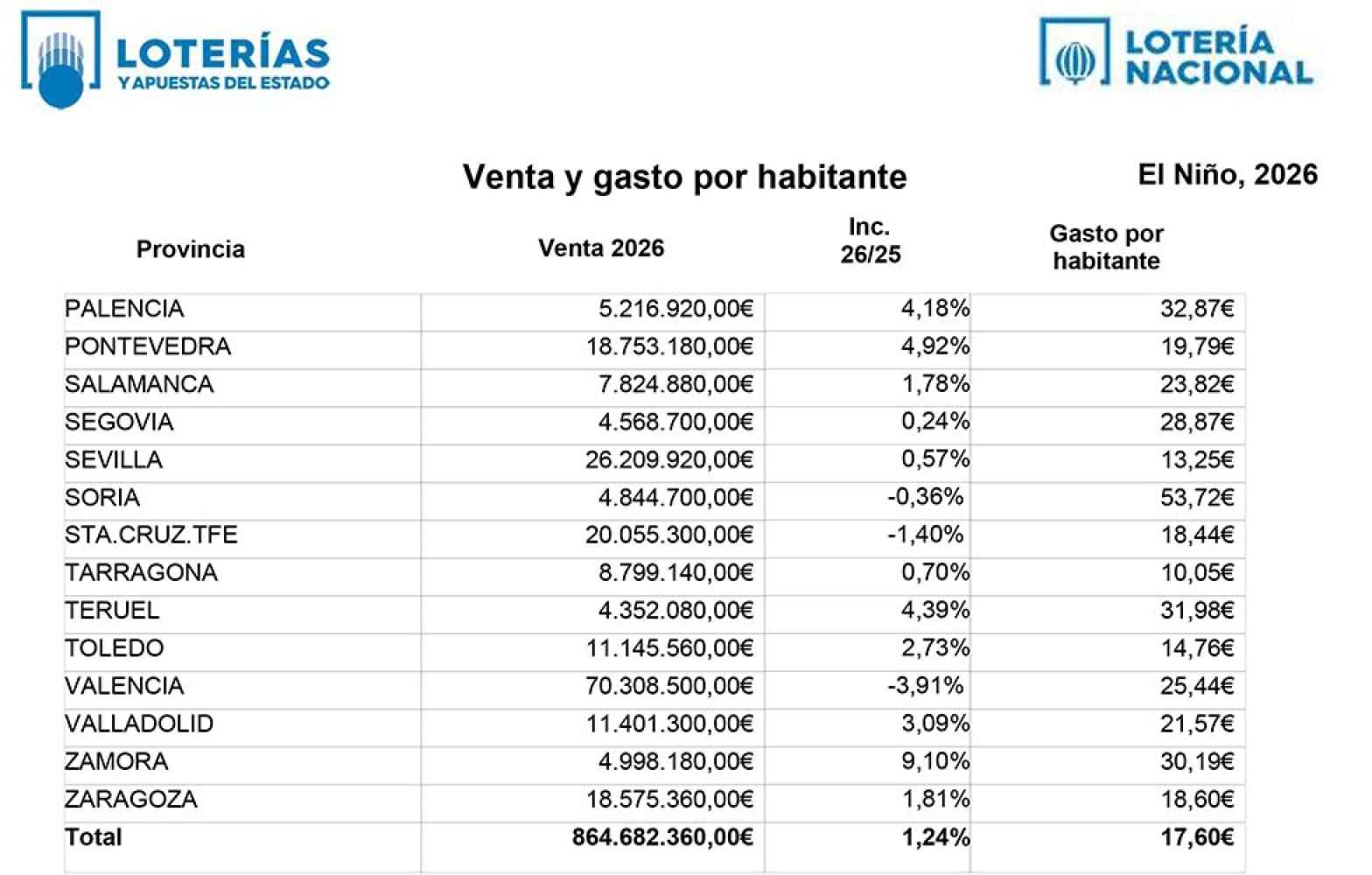 El Sorteo Extraordinario de El Niño ha tenido, en la edición de este recién estrenado 2026, una facturación total de 864.682.360 euros, según datos provisionales.