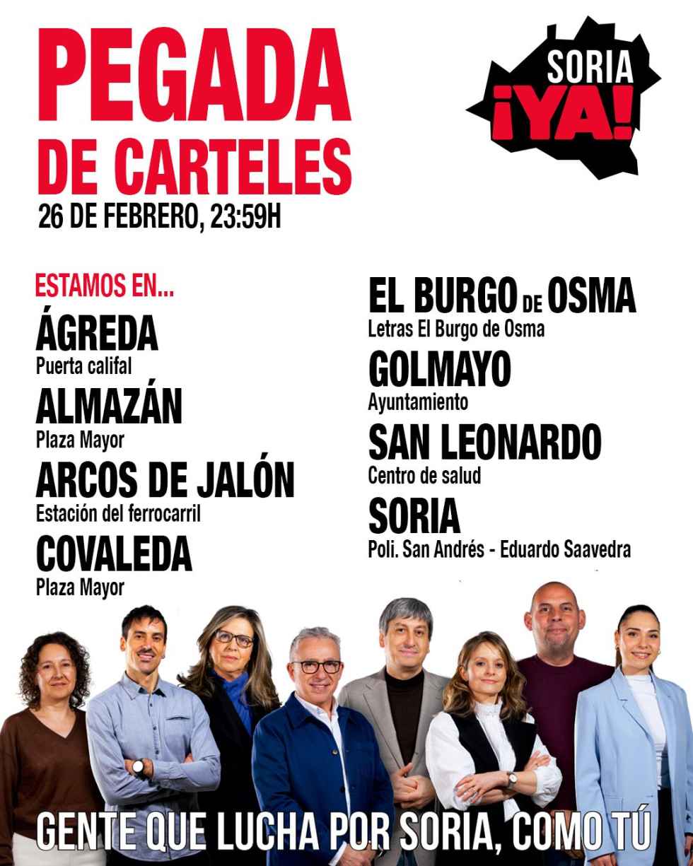 La pegada de carteles se realizará esta noche en ocho puntos de la provincia: Ágreda (Puerta califal), Almazán (Plaza Mayor), Arcos de Jalón (Estación del ferrocarril), Covaleda (Plaza Mayor), El Burgo de Osma (Letras El Burgo de Osma), Golmayo (Ayuntamiento), San Leonardo (Centro de salud) y Soria (Polideportivo del San Andrés - Eduardo Saavedra).