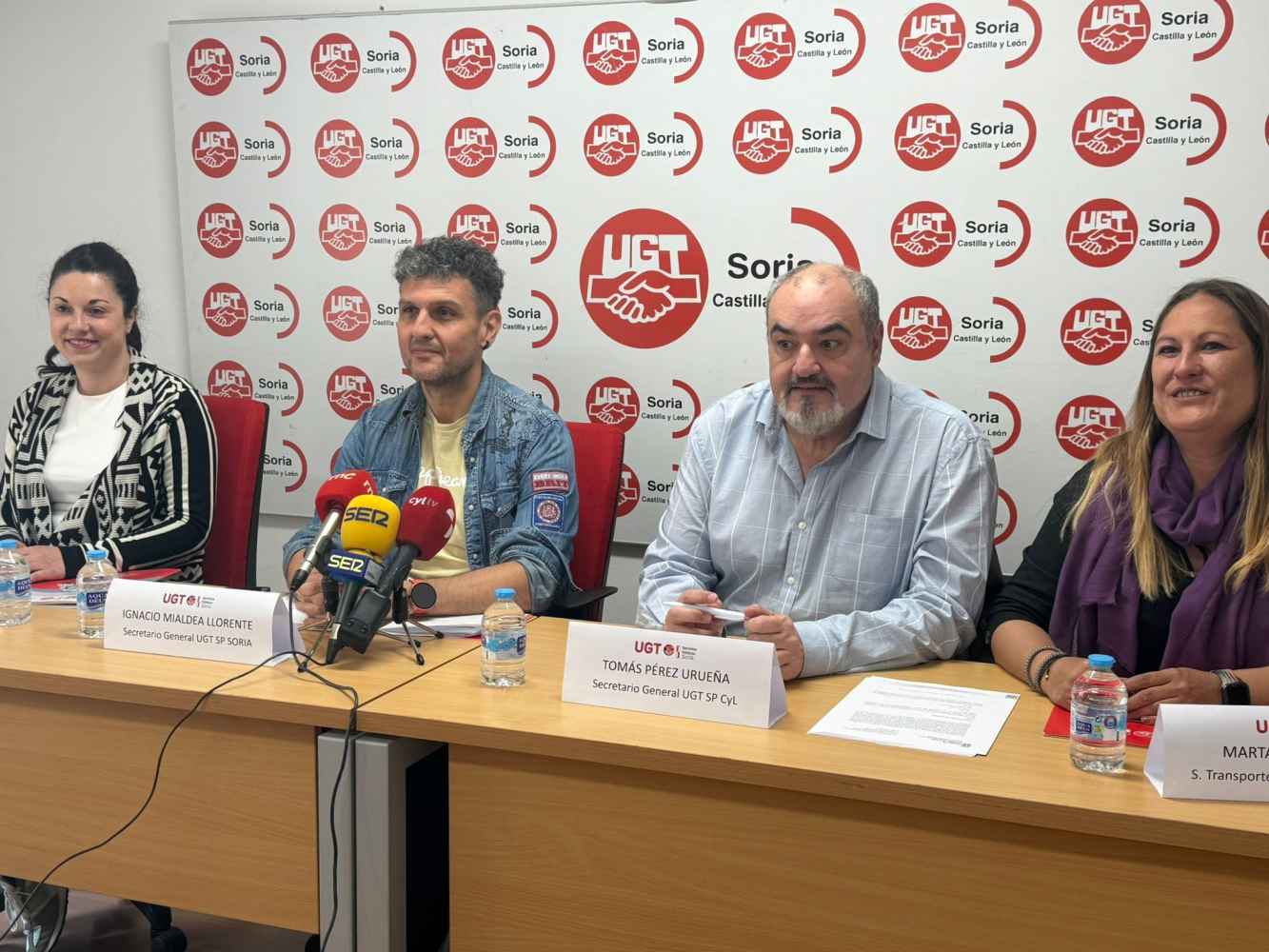 Ignacio Mialdea, secretario general UGT sp Soria, junto con Tomás Pérez Ureña, secretario general UGT sp Cyl, Marta Vían, secretaria de Transporte Sanitario UGT sp Csyl, y María Yusta, de Transporte Sanitario UGT Soria, han explicado la situación de estos trabajadores en la provincia.