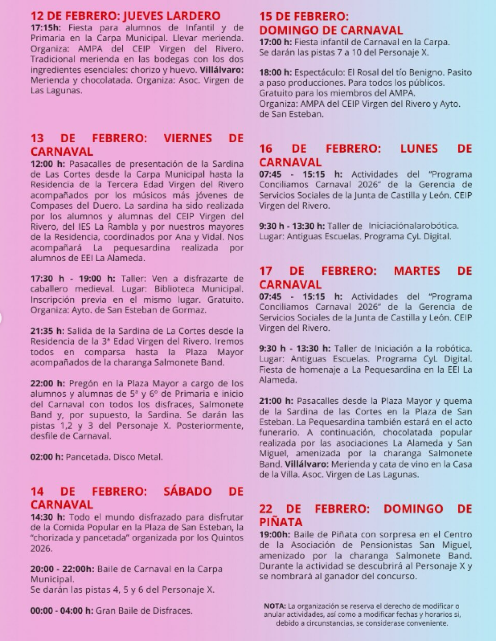 El Ayuntamiento de San Esteban de Gormaz ha publicado su programa para los carnavales 2026. Comenzará con el tradicional Jueves Lardero y se prolongará hasta el martes 17 de febrero. Puede consultarlo a continuación.