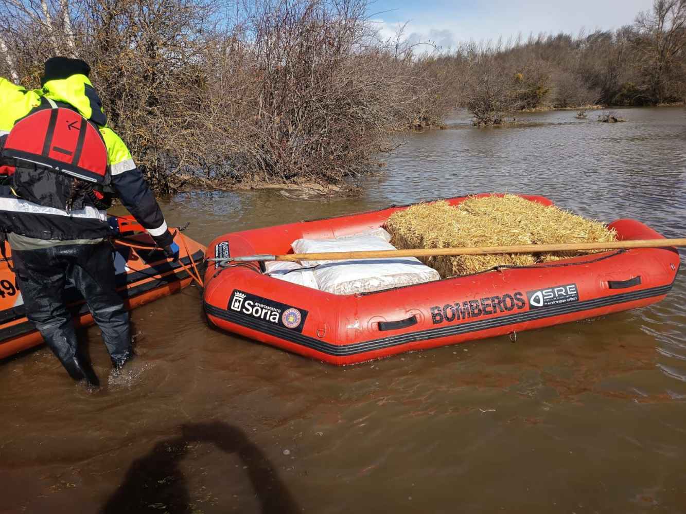 El Servicio de Prevención y Extinción de Incendios de Soria ha intervenido este mediodía en el término municipal de Garray para garantizar el aporte de alimento a una explotación ganadera cuyos animales permanecen aislados por el agua tras las inundaciones registradas en la zona.